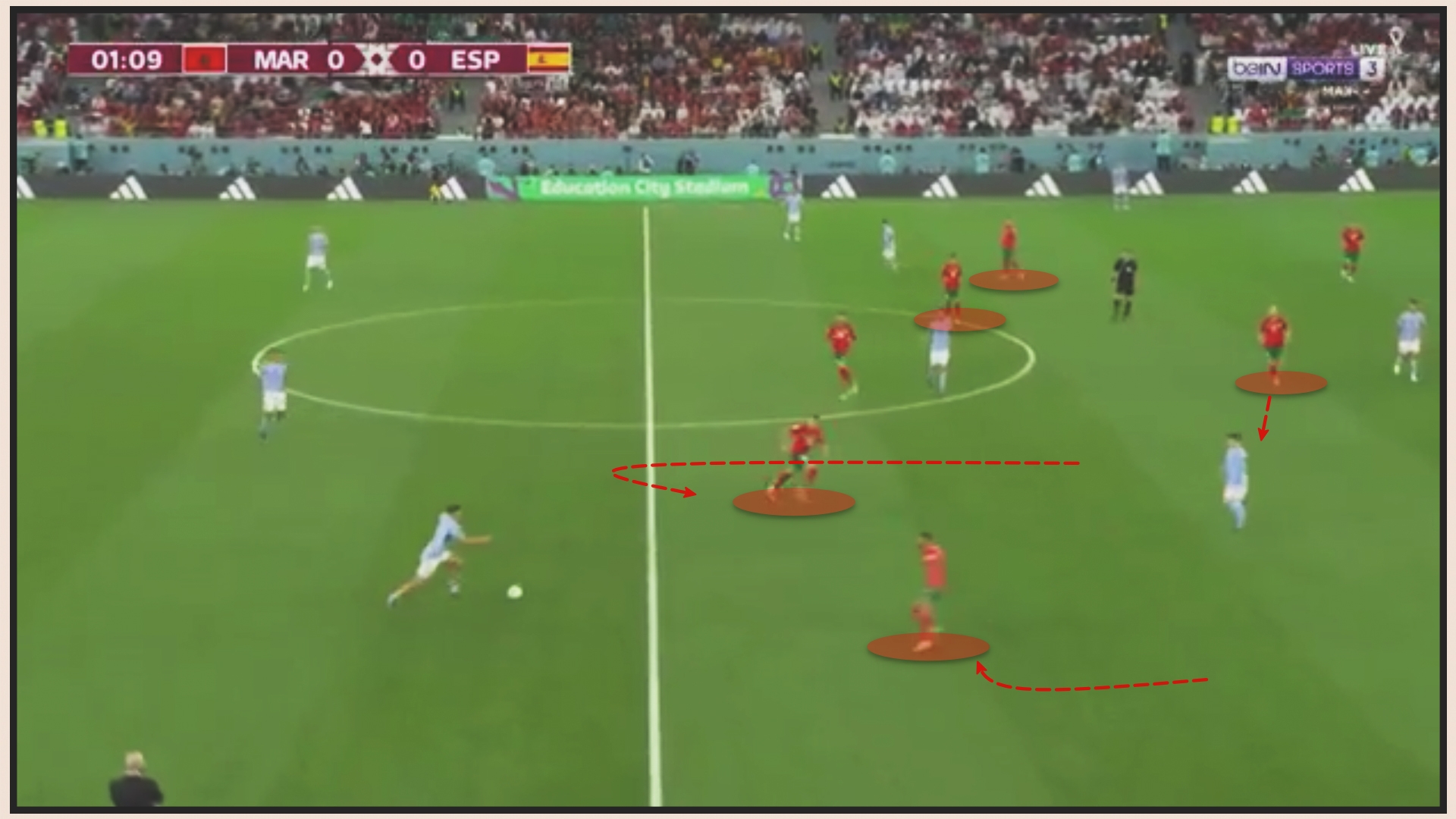 Tiền vệ cánh ở biên gần bóng được yêu cầu lùi lại đường line 4 hậu vệ khi Tây Ban Nha đưa được bóng xuống cuối sân. Morocco vận hành hệ thống 5-4-1 ở khu vực này. Mục đích là có đủ người theo chiều ngang kiểm soát được các đường bóng thả xuống chiều sâu của đối phương ở khu vực hành lang trong.