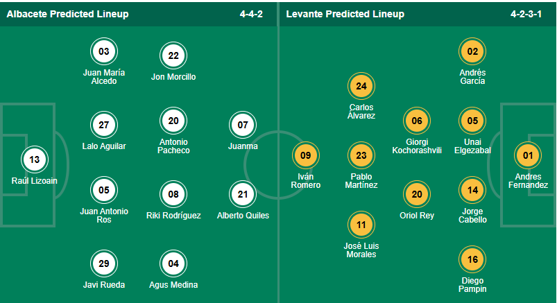 Levante đứng thứ 8 mùa trước, họ đã từng đá tại La Liga nên đội bóng của HLV Julián Calero muốn chơi tốt hơn mùa giải này để giành vé thăng hạng. Vị trí thứ 6 cho thấy sự tiến bộ đôi chút nhưng như thế là chưa đủ và các cầu thủ Levante cần chơi tốt hơn nữa. Họ cần làm tốt hơn thành tích chỉ thắng 2/6 vòng gần đây nên khi đến làm khách trên sân của Albecete thì 3 điểm là điều mà Levante cần làm được. Đây không phải điều khó thực hiện với các cầu thủ khách bởi dù gì họ cũng là đội có thực lực mạnh hơn.
