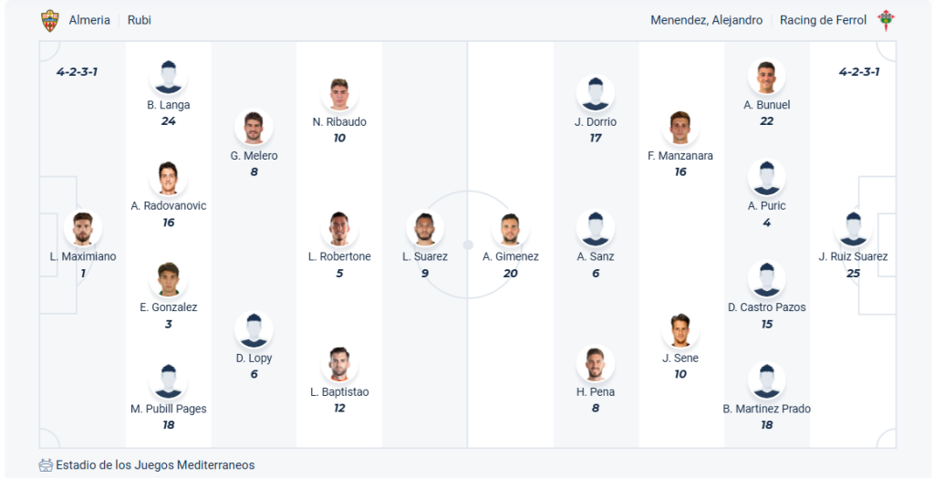 Almeria bị xuống hạng từ La Liga mùa trước khi chỉ đứng thứ 19 chung cuộc. Đội bóng của HLV Rubi quyết tâm giành vé thăng hạng luôn, tuy nhiên mọi thứ đang diễn ra không như dự định của đội bóng này. Almeria đang đứng thứ 8 trên bảng xếp hạng và gần như không còn khả năng chiếc vé thăng hạn. Dù vậy các cầu thủ Almeria vẫn sẽ muốn thắng các trận còn lại để có vị trí cao hơn nhất có thể. Racing Ferrol không phải đối thủ có thể cản bước Almeria vào lúc này và nhiều khả năng đội bóng chủ nhà sẽ đạt được mục đích.