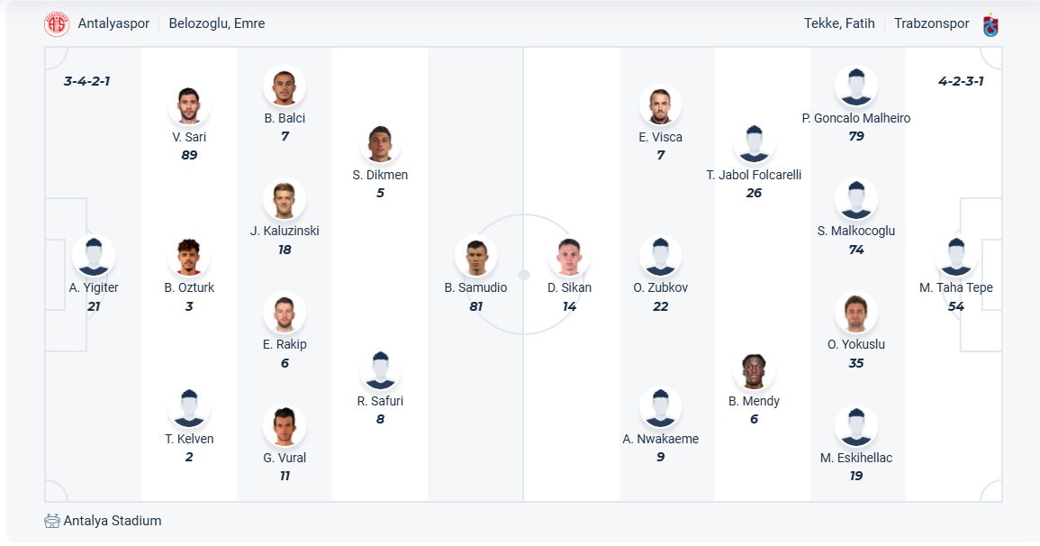 Antalyaspor đang đứng thứ 14 trên bảng xếp hạng, so với vị trí thứ 10 mùa giải trước thì rõ ràng đội bóng của HLV Emre Belözoğlu đang làm không tốt nhiệm vụ của mình. Việc họ chỉ thắng 1 trong 6 vòng đấu gần nhất cho thấy điều đó, trận đấu còn lại không còn nhiều ý nghĩa với đội bóng này do họ đã trụ hạng thành công. Các cầu thủ Antalyaspor chỉ đơn giản muốn kết thúc mùa giải với một kết quả tốt nhưng việc phải đối đầu với đội bóng mạnh như Trabzonspor thì xem ra cơ hội có điểm không cao, nhiều khả năng đội bóng chủ nhà sẽ để thua trận này.