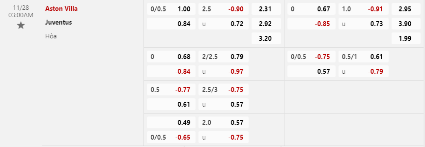 Soi kèo châu Á Aston Villa vs Juventus: 0.77*0.5*0.61