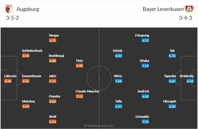 Augsburg đang đứng thứ 13 trên bảng xếp hạng, so với vị trí thứ 11 mùa trước thì đội bóng của HLV Jess Thorup đang chưa làm tốt ở mùa giải này nhưng đây không phải thành tích quá tệ bởi họ không phải đội có tiềm lực mạnh. Phong độ của Augsburg thời gian gần đây cũng là tương đối tốt khi chỉ để thua 1 trong 6 vòng gần nhất. Chính vì vậy các cầu thủ muốn có thêm một trận đấu tốt nữa để cải thiện thứ hạng. Tuy nhiên đối thủ của họ ở vòng này là Leverkusen đang có phong độ cực cao nên xem ra cơ hội có điểm không cao, nhiều khả năng Augsburg sẽ phải nhận thất bại.