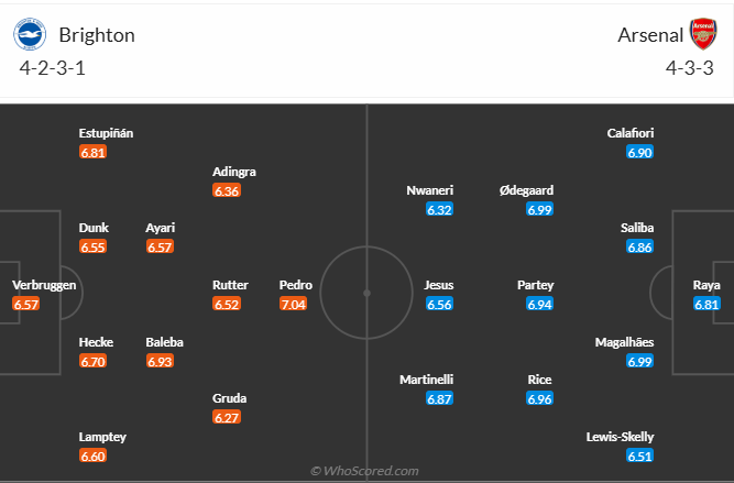 Brighton là đội để hòa nhiều nhất cho đến thời điểm này của mùa giải, họ hòa đến 9 trận trong đó 3 trận gần nhất đều hòa. 6 vòng gần nhất đội bóng này không thể thắng nhưng không dễ để đội khác đánh bại họ. Vị trí thứ 10 trên bảng xếp hạng không phải kết quả tệ của thầy trò HLV  Fabian Hürzeler nhưng họ muốn nhiều hơn thế. Muốn vậy thì các cầu thủ Brighton cần giành chiến thắng chứ không thể tiếp tục chuỗi trận như vừa qua. Tuy nhiên trước đối thủ mạnh như Arsenal ở vòng 20 thì cơ hội có 3 điểm không cao, nhiều khả năng Brighton sẽ chơi đầy cố gắng và có thêm một trận hòa nữa.