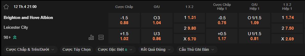 Brighton 3-1 Leicester (Chọn Brighton Tài trận).