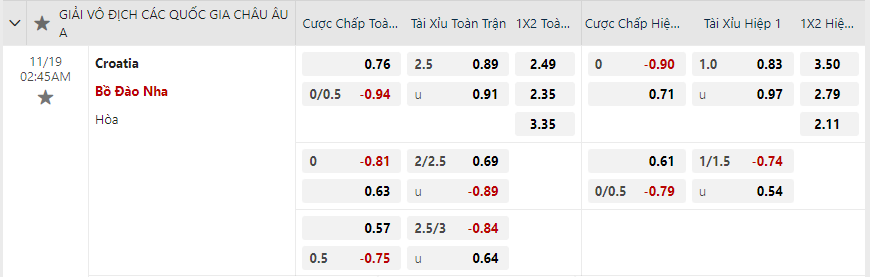 Soi kèo hiệp 1 Croatia vs Bồ Đào Nha: 0.71*0*0.90