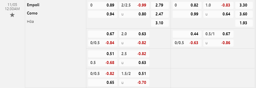 Soi kèo hiệp 1 Empoli vs Como: 0.82*0*0.99