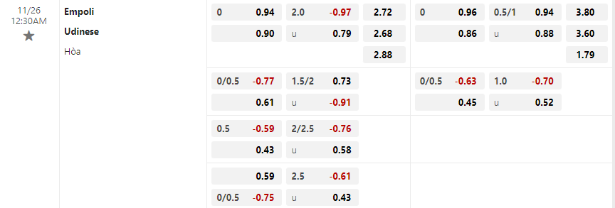 Soi kèo châu Á Empoli vs Udinese: 0.94*0*0.90