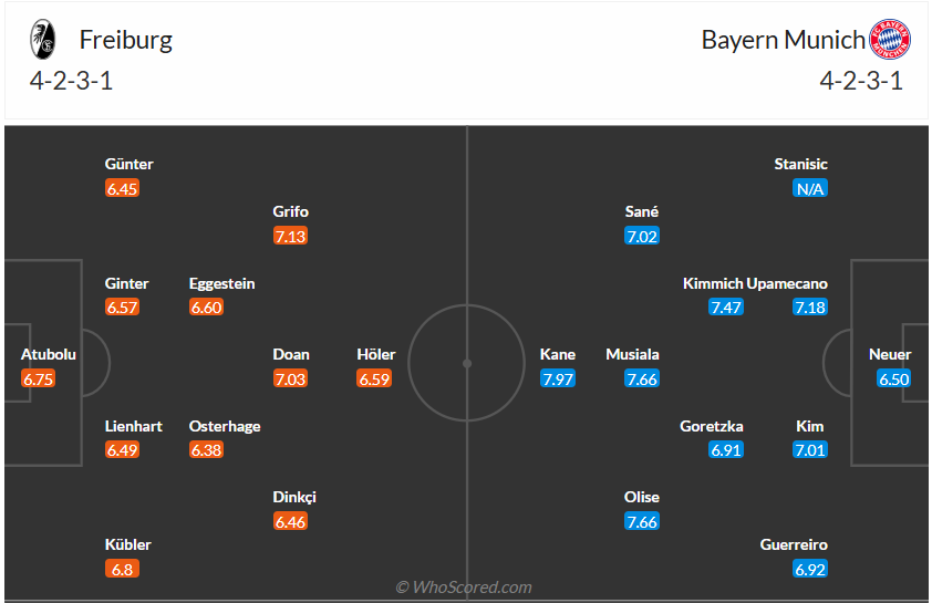 Bayern chơi tốt ở 4 vòng gần nhất khi toàn thắng, họ vẫn đứng đầu bảng Bundesliga, cơ hội giành chức vô địch của thầy trò HLV VIncent Kompany là rất sáng. Tuy nhiên trận thua vừa qua ở Champions League khiến các cầu thủ Bayern rất thất vọng, họ thua dù đã dứt điểm rất nhiều nên rất cần một chiến thắng để các chân sút lấy lại sự tự tin. Chính vì vậy Bayern sẽ chơi hết mình để có chiến thắng hoành tráng nhất ở vòng 19 Bundesliga này nên sẽ không có gì ngạc nhiên nếu họ áp đảo đội bóng yếu hơn khá nhiều như Freiburg và giành chiến thắng với tỉ số cách biệt.