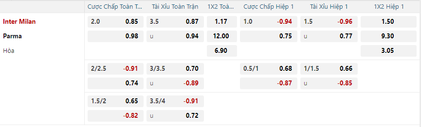 Soi kèo hiệp 1 Inter Milan vs Parma: 0.94*1.0*0.75