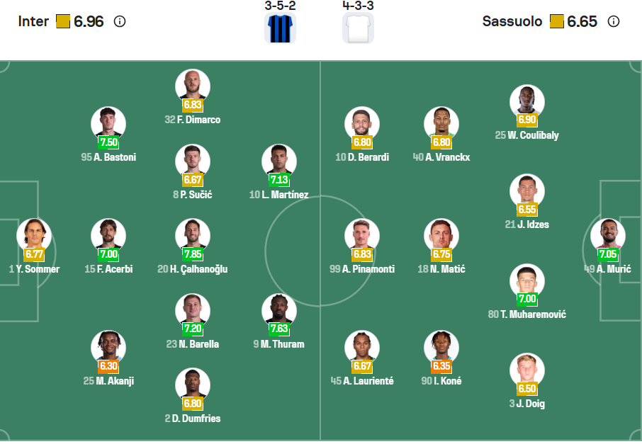 Inter là đội Á quân mùa trước, họ để mất chức vô địch vào tay Napoli một cách vô cùng đáng tiếc, sau đó là trận thua tại chung kết Champions League khiến huấn luyện viên Inzaghi từ chức. Dưới sự dẫn dắt của HLV Cristian Chivu, các cầu thủ Inter có sự khởi đầu mùa giải vô cùng khó khăn khi thua 2, thắng 1 sau 3 vòng đấu đầu tiên. Đây là thành tích rất tệ và các cầu thủ Inter cần chơi tốt hơn rất nhiều ở các trận đấu sắp tới của mình. Chiến thắng gần nhất tại Champions League cúp Inter tự tin hơn và khả năng họ sẽ thể hiện đúng đẳng cấp của mình để có chiến thắng trước Sassuolo.