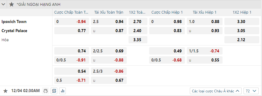 Ipswich Town có 3/4 trận gần nhất kết thúc với kết quả Xỉu. Còn Crystal Palace cũng có 2/3 trận vừa qua về Xỉu. Do đó cửa Xỉu sẽ là lựa chọn hợp lý dành cho người chơi ở kèo đấu này. Mời các bạn cùng xem truc tiep bong da trên kênh Xôi Lạc TV.