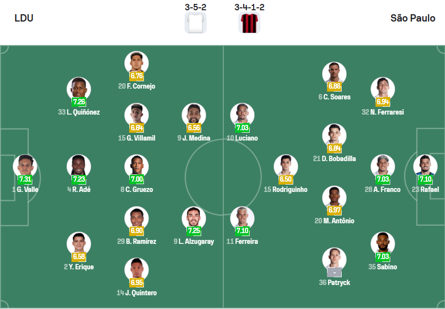 Sao Paulo cũng từng vô địch Copa Libertadores nhưng còn trước cả LDU, họ đã lâu lắm không thể vô địch quốc gia và giờ không phải đội nằm trong top mạnh nhất của Brazil. Với chất lượng đội hình không mạnh như xưa thì thầy trò HLV Hernán Crespo không được đánh giá cao khả năng vô địch bằng các đội bóng đồng hương khác và họ được dự đoán gặp nhiều khó khăn ở vòng tứ kết khi đụng đối thủ như LDU. Trận lượt đi trên sân khách sẽ rất khó cho Sao Paulo và rất có thể họ sẽ không thể có kết quả tốt ra về.