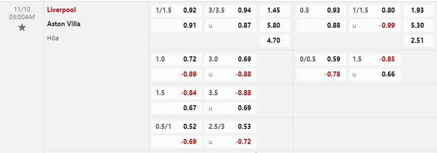 Soi kèo châu Á Liverpool vs Aston Villa: 0.89*1.0*0.72