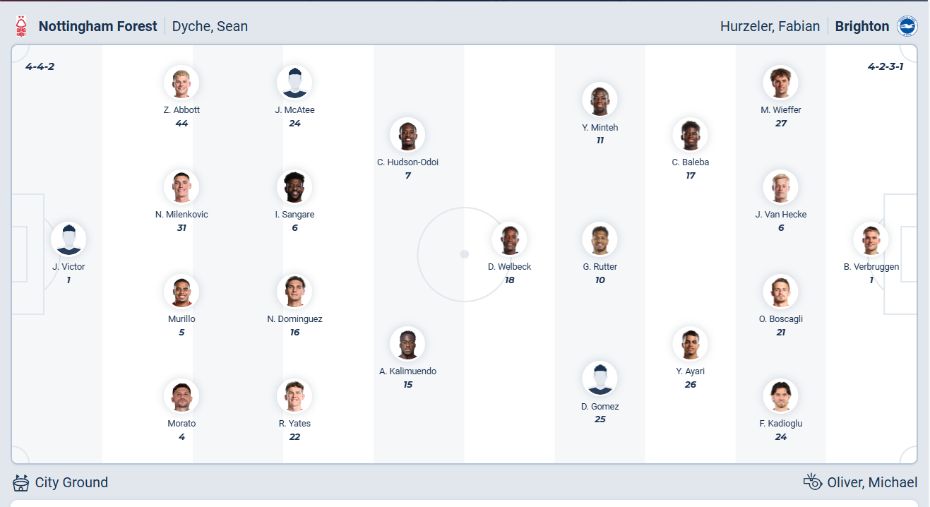 Brighton thắng 3 và chỉ để thua 1 trong 5 vòng đấu gần nhất, đội bóng của HLV Fabian Hürzeler vẫn luôn là đối thủ khó chơi với bất cứ đội bóng nào và họ vẫn vững vàng ở giữa bảng xếp hạng. Thậm chí giờ Brighton còn đang đứng thứ 6, đây là điều giúp các cầu thủ Brighton rất tự tin khi bước vào vòng đấu thứ 13 này. Các cầu thủ Brighton hướng đến một chiến thắng nữa và rất có thể dù gặp nhiều khó khăn trước chủ nhà Notitngham nhưng đội khách vẫn biết cách tận dụng cơ hội để ra về với 3 điểm trọn vẹn.