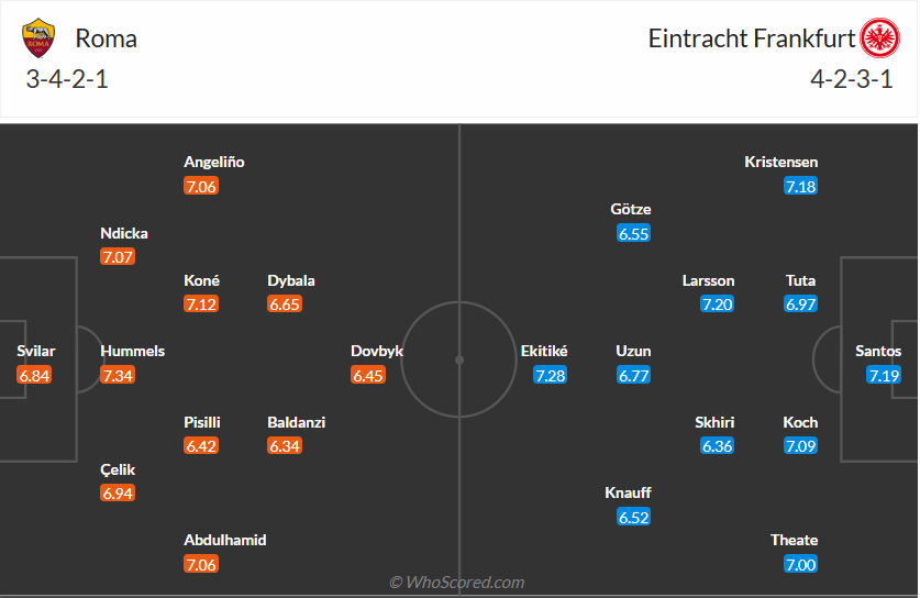 Frankfurt đang chơi tốt mùa giải này, họ đang đứng thứ 2 tại Europa League và cũng đang chơi tốt tại Bundesliga. Đội bóng của HLV Dino Toppmöller thắng 4, hòa 1 trong 5 trận gần nhất của mình. Tại Europa League dù đang đứng thứ 2 nhưng nguy cơ rơi ra khỏi top 8 là vẫn còn dù rất nhỏ nên các cầu thủ Frankfurt vẫn cần ít nhất 1 điểm ở lượt trận cuối cùng này để không phải nhìn kết quả các trận đấu khác. Chính vì vậy họ vẫn sẽ bước vào trận đấu gặp Roma với một quyết tâm cao và nhiều khả năng đội bóng nước Đức sẽ có 1 điểm ra về.