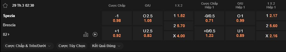 - Soi kèo tài xỉu Spezia vs Brescia: 1.06*2.5*0.88