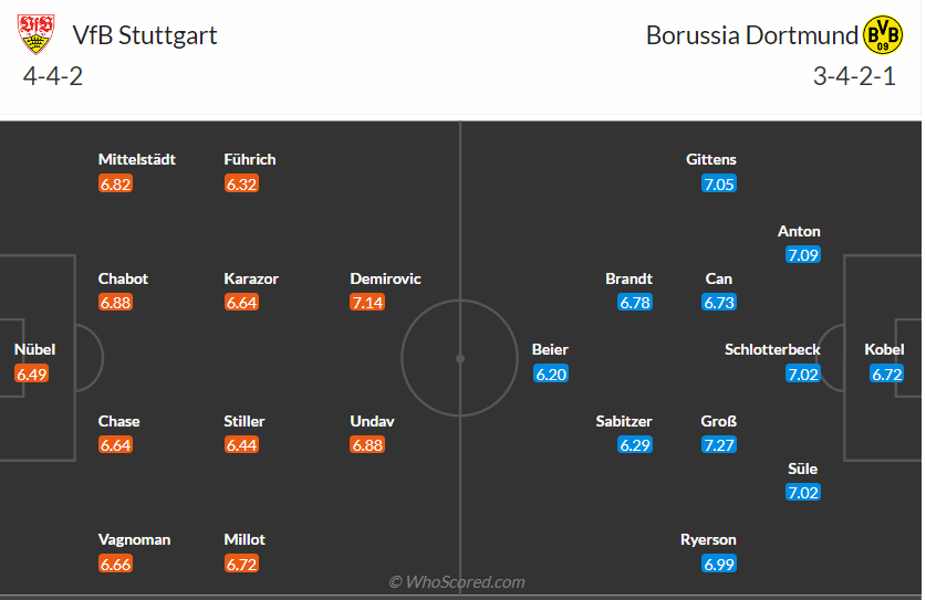 Dortmund dù được đánh giá cao nhưng lại chơi không tốt mùa giải trước, họ chỉ cán đích ở vị trí thứ 5 và chỉ được dự Champions League nhờ vé thưởng của UEFA. Đây là điều khiến đội bóng này có sự thay đổi trên băng ghế chỉ đạo và HLV trẻ Nuri Şahin lên nắm quyền với mục tiêu giúp các cầu thủ Dortmund trở lại với vị thế là đội bóng hàng đầu nước Đức. Họ đang chơi rất ổn khi thắng 4, hòa 1 sau 5 trận đã đấu cho đến thời điểm này của mùa giải. Với phong độ này thì Dortmund rất tự tin khi đến làm khách trên sân của Stuttgart và nhiều khả năng họ sẽ có 3 điểm ra về.