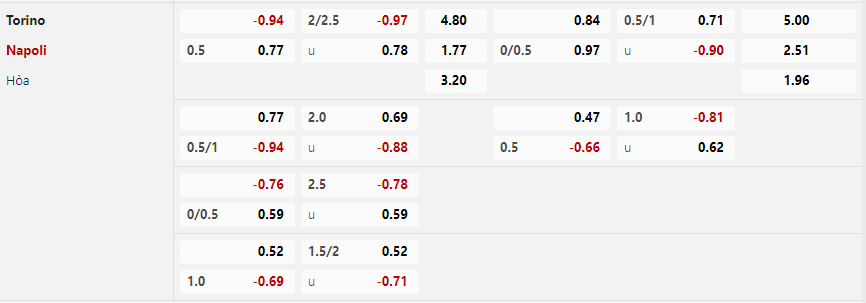 Soi kèo châu Á Torino vs Napoli: 0.77*-0.5*0.94