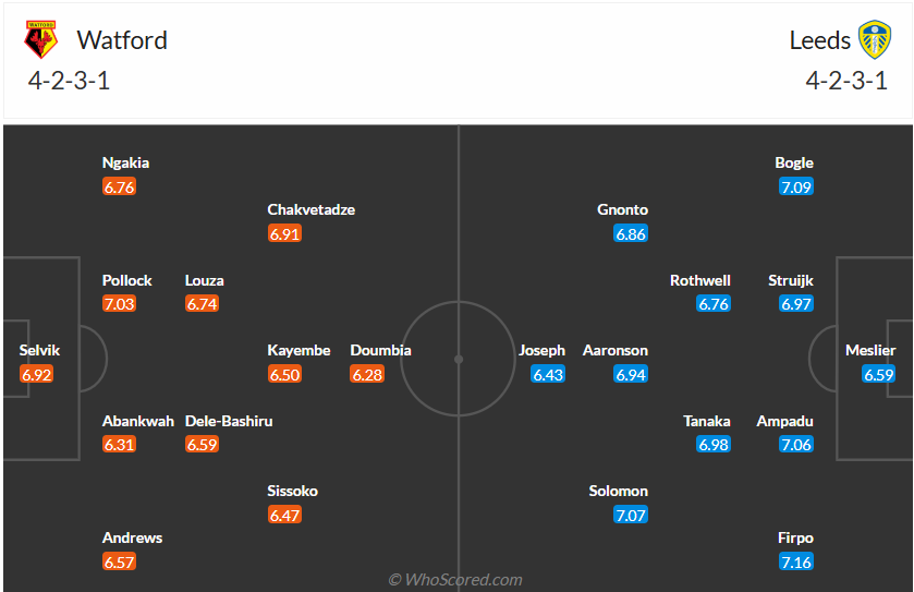 Watford đang đứng thứ 10 trên bảng xếp hạng, họ tụt xuống vị trí này sau khi thua 3, hòa 1 trong 4 vòng gần nhất. Dù vẫn tiến bộ hơn so với vị trí thứ 15 mùa giải trước nhưng đội bóng của HLV Tom Cleverley không được phép để mất điểm nữa nếu còn muốn có một vị trí cao trên bảng xếp hạng. Họ muốn có một kết quả tốt ở vòng đấu thứ 32 này nhưng với việc phải đối đầu với một Leeds đang đứng đầu bảng và có phong độ cao thì nhiều khả năng Watford sẽ không thể có được điều mình cần, họ sẽ để thua trận đấu này.